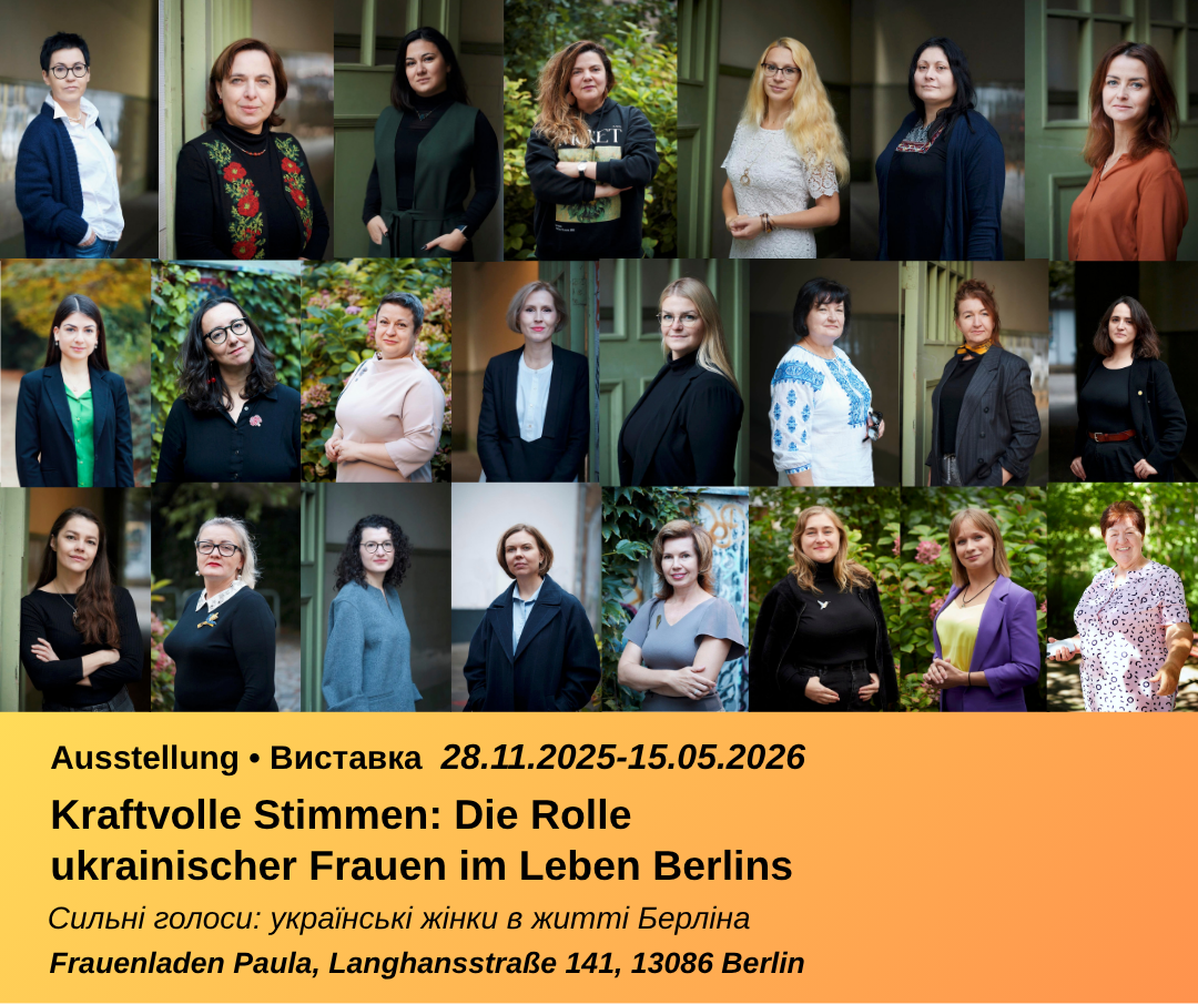 Frauenladen Paula Panke Langhansstraße 141, BerlinDie Ausstellung zeigt Portraits und Geschichten ukrainischer Frauen, die sich in Berlin auf verschiedene Weise engagieren. Gemeinsam zeigen sie, dass Migration nicht nur eine Herausforderung, sondern eine Bereicherung für die Stadt ist – durch neue Perspektiven, Ideen und Engagement. Die Ausstellung läuft bis zum 15.05.2026 und ist Teil des PfD-Projekts "Meine Stimme zählt - Frauen aus der Ukraine gestalten mit".
