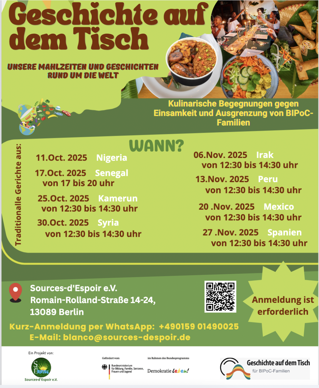 Im PfD-Projekt "Geschichte auf dem Tisch: Kulinarische Begegnungen gegen Einsamkeit und Ausgrenzung von BIPoC-Familien" erwarten euch Mahlzeiten und Geschichten aus aller Welt, dieses Mals aus Kamerun. Der Raum unterstützt dabei, soziale Bindungen aufzubauen, Resilienz zu stärken und demokratische Teilhabe praktisch erfahrbar werden zu lassen.