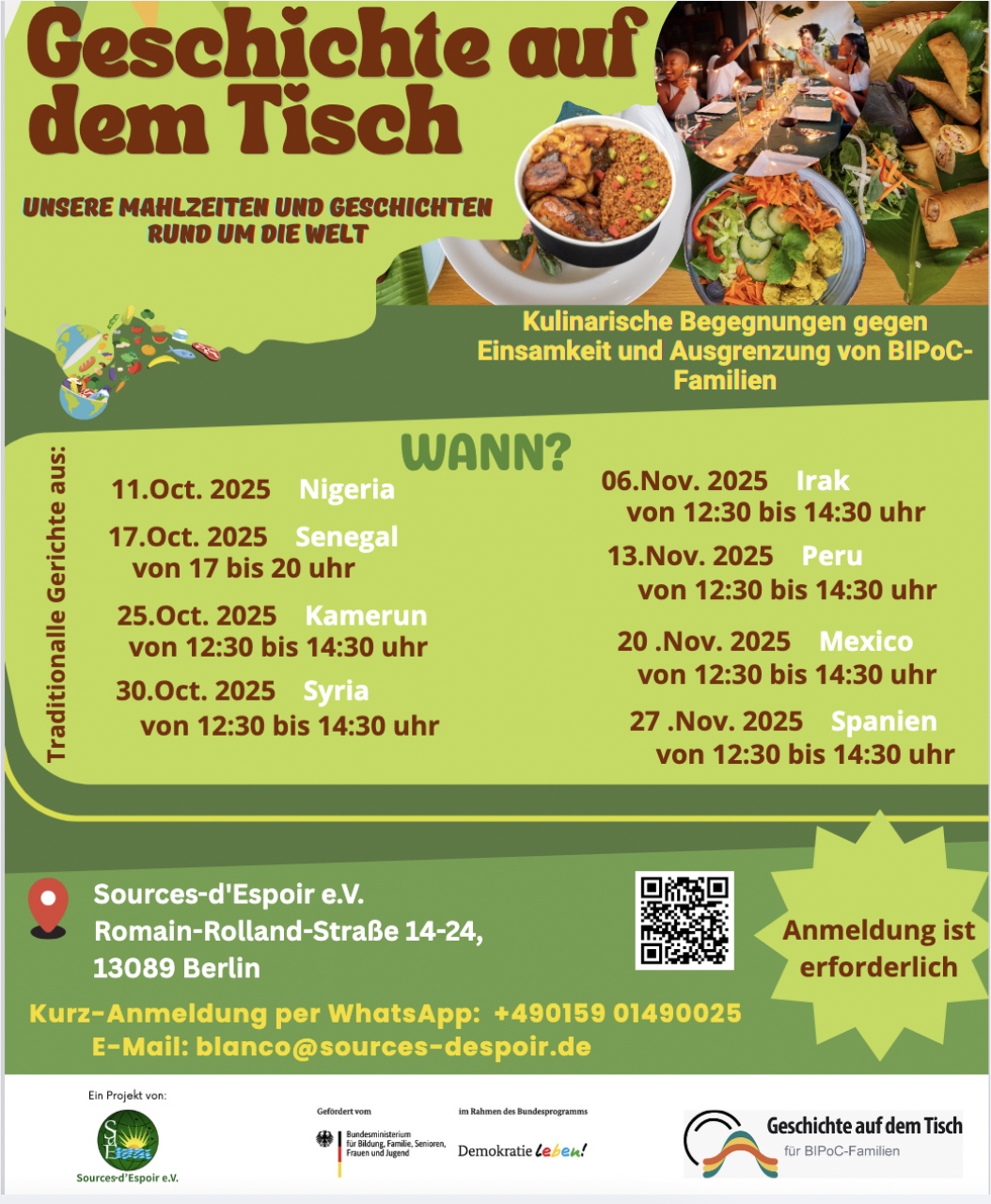 Im PfD-Projekt "Geschichte auf dem Tisch: Kulinarische Begegnungen gegen Einsamkeit und Ausgrenzung von BIPoC-Familien" erwarten euch Mahlzeiten und Geschichten aus aller Welt – dieses Mal aus Senegal. Der Raum unterstützt dabei, soziale Bindungen aufzubauen, Resilienz zu stärken und demokratische Teilhabe praktisch erfahrbar werden zu lassen.