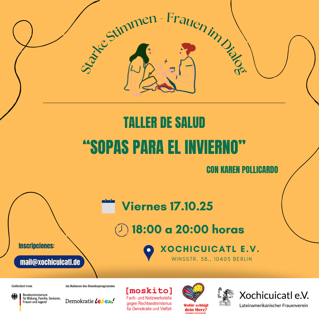 Im Rahmen des PfD-Projekts "Starke Stimmen – Frauen im Dialog" bietet dieser Abend über leckere Rezepte hinaus einen Moment der Ruhe und Selbstfürsorge, in dem sich die Teilnemenden vom Alltagsstress lösen können, gesunde Gerichte zubereiten lernen und gleichzeitig mit anderen Frauen in Kontakt kommen können. Das Angebot richtet sich an spanischsprachige Frauen.